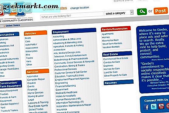 Nama konyol disisihkan, Geebo sebenarnya cukup bagus. Ini adalah situs web rahasia lain dan alternatif Craigslist yang mencakup berbagai kategori. Dari pekerjaan ke kapal, hewan peliharaan ke darat, ada sedikit dari semuanya di sini. Geebo lebih baik dikuratori daripada Craigslist, yang sangat sulit untuk ditunjukkan. Meskipun mungkin masih ada scammers yang bersembunyi di sana, melaporkannya dan menghapusnya sangat mudah.