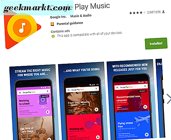 Google Play Music adalah upaya Google sendiri untuk mengambil pangsa pasar dari iTunes dan Spotify. Ini memungkinkan Anda mengupload musik Anda sendiri serta mendengarkan daftar putar dari orang lain dan dikurasi oleh Google sendiri. Ada jutaan lagu dan berlangganan akun premium dan Anda dapat mengunduh musik ke perangkat Anda.