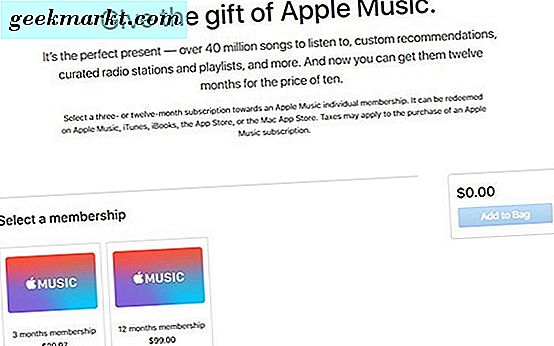 Apple Music memungkinkan berlangganan untuk diberikan melalui kartu hadiah online, dan membeli hadiah berlangganan 12 bulan menghemat $ 20 dalam jangka panjang dibandingkan dengan rencana $ 9, 99 / bulan. Kartu hadiah Spotify tersedia di toko-toko, meskipun tampaknya tidak ada penghematan nyata dari langganan hadiah mereka.