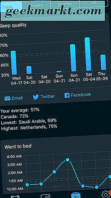 Fitur ini adalah cara yang bagus untuk membandingkan tidur Anda selama jangka waktu tertentu dan melihat pola tidur seperti apa yang Anda miliki pada hari ke hari, minggu ke minggu, atau bulan ke bulan. Aplikasi ini juga memberi Anda persentase "kualitas tidur" yang mempertimbangkan semua data dan statistik yang tersedia untuk memberi Anda angka persentase seberapa baik tidur Anda. Biasanya, semakin lama tidur dan semakin banyak waktu yang dihabiskan dalam tidur nyenyak sering membantu persentasenya menjadi lebih tinggi. Tapi selain hanya menyediakan persentase Anda, aplikasi ini juga memberi Anda kualitas tidur rata-rata di negara Anda dan juga menunjukkan negara mana yang memiliki yang terbaik dan terburuk dalam kategori itu. Aplikasi ini juga melacak hal-hal seperti waktu tidur, waktu Anda pergi tidur, waktu Anda bangun dan banyak lagi (dan juga memberi Anda rata-rata, terbaik dan terburuk untuk kategori ini juga).