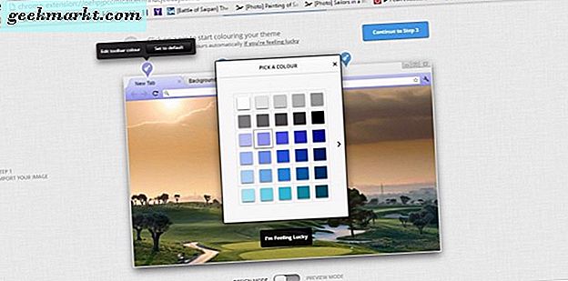 Tekan Lanjutkan ke Langkah 2 untuk mengedit skema warna tema. Kemudian Anda dapat menyesuaikan warna tab bar, tab aktif dan latar belakang dengan mengklik ikon kuas seperti pada gambar di bawah ini. Pilih warna dari palet untuk ditambahkan ke tema. Alternatif lain, Anda dapat menekan opsi Saya Lagi Beruntung untuk segera mengatur skema warna yang cocok dengan gambar.