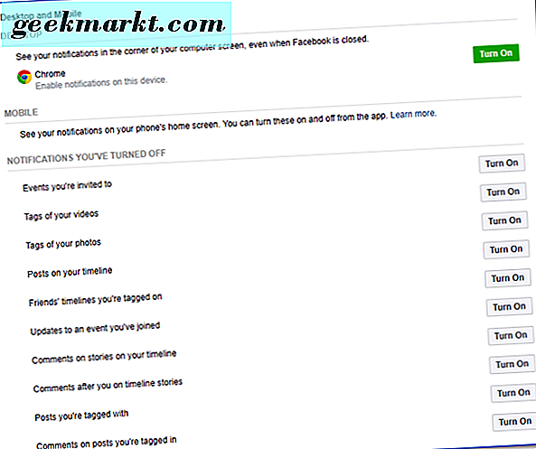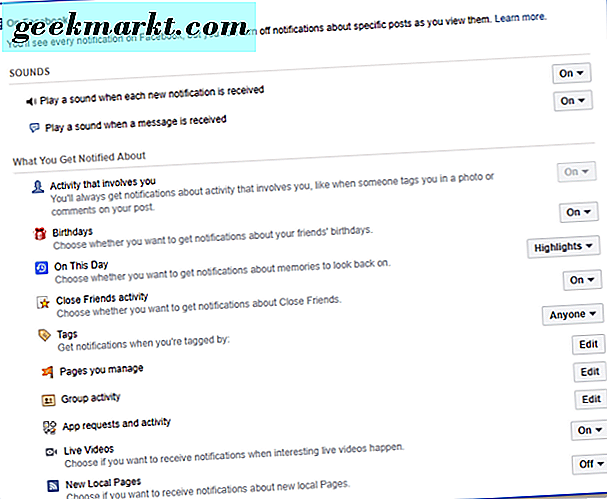 Tentu saja, Facebook, dalam upaya tanpa akhir untuk memasukkan diri ke dalam setiap aspek kehidupan kita, tidak akan membiarkan Anda mencegah pemberitahuan sepenuhnya. Mereka, bagaimanapun, memungkinkan Anda untuk "memilih apa yang Anda diberitahu tentang" di pengaturan notifikasi mereka. Dengan cara ini, Anda dapat secara dramatis mengurangi pemberitahuan Facebook Anda dan mencegah formulir pemberitahuan yang paling mengganggu.