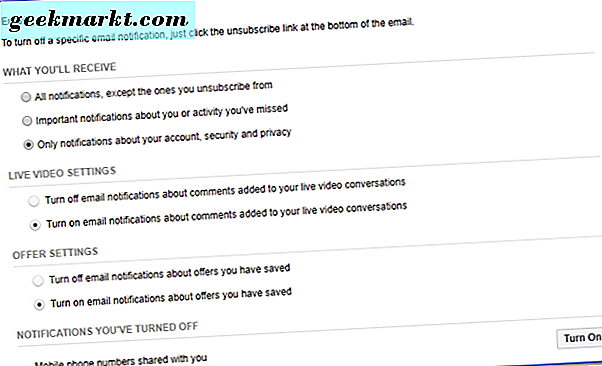 Pemberitahuan ini hanya terkait dengan alamat email yang terkait dengan profil Facebook Anda. Seperti halnya pemberitahuan Facebook di atas, Anda tidak dapat mematikan pemberitahuan ini sepenuhnya. Namun, Anda dapat membatasi jumlah pemberitahuan yang Anda terima secara dramatis.