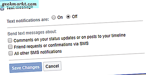Ini adalah kemungkinan yang paling menjengkelkan dari semua pemberitahuan Facebook baru. Kecuali Anda memiliki SMS tanpa batas, pesan-pesan ini bisa menghabiskan uang Anda. Hal terakhir yang Anda inginkan adalah diganggu oleh Facebook DAN memiliki tagihan besar untuk diperjuangkan. Untungnya, ini juga mudah dimatikan.