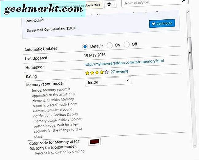 RAM adalah salah satu sumber daya sistem yang paling penting yang secara efektif merupakan penyimpanan sementara yang diperlukan untuk menjalankan perangkat lunak. Anda dapat memeriksa penggunaan RAM secara keseluruhan dengan Task Manager di Windows 10. Namun, untuk rincian lebih spesifik tentang berapa banyak RAM yang diponopoli peramban Firefox Anda, periksa tentang addons-addons addons-memory 2016 dan Tab Memory Add.