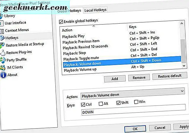 Atau, tambahkan hotkey yang sama sekali baru ke WMP dengan menekan tombol Tambah . Pilih tindakan untuk hotkey dari menu drop-down Action. Kemudian Anda dapat mengatur pintasan keyboard untuknya dengan kotak centang dan kotak teks di bawah menu drop-down. Klik Apply dan OK untuk menerapkan pengaturan hotkey baru. Perhatikan bahwa karena ini adalah hotkey global, Anda masih dapat menggunakannya ketika Windows Media Player tidak aktif, jendela yang dipilih.