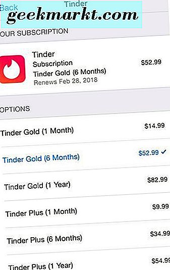 Tinder Gold tidak murah. Jika Anda sudah memiliki Tinder Plus, itu adalah tambahan $ 4, 99 di atas itu, jadi $ 82, 99 setahun atau $ 14, 99 per bulan.