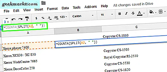 Untuk menghitung setiap kata dalam sel, kami menggunakan rumus Google Spreadsheet khusus: ' = COUNTA (SPLIT (A2, ”“)) '. Seperti yang terlihat pada gambar di atas, menggunakan rumus ini secara otomatis memberikan hitungan kata-kata dalam sel tertentu. COUNT auto-menghitung kata-kata dalam sel, SPLIT menghitung semuanya dipisahkan oleh spasi sebagai titik data individu (sehingga, misalnya, konten Anda dapat dihitung bahkan jika itu hanya angka sebagai kata) dan bagian akhir ( lihat di sini sebagai A2) menghitung sel yang ingin Anda lihat. Seperti biasa di Google Spreadsheet, setiap sel tertentu memungkinkan Anda untuk dengan mudah melacak data Anda dengan menggunakan format lokasi berbasis grid (misalnya, A2 menemukan sel kedua di kolom A), jadi pastikan Anda tahu sel mana yang Anda cari . Berikut ini cara menggunakan rumus ini: