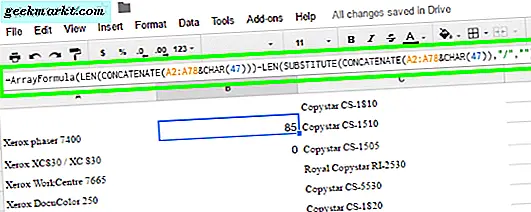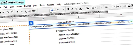 Seprai tidak sepenuhnya tanpa kemampuan untuk menghitung kata dalam dokumen. Meskipun tidak ada alat penghitung kata resmi, seperti yang mungkin Anda temukan di Google Docs, Sheets tidak menampilkan jumlah teks dalam kolom, baris, dan sel tertentu. Untuk mempratinjau Anda ini, klik pada sel, apakah itu memiliki formula atau hanya label di dalamnya. Anda akan melihat di kotak pratinjau di bagian atas halaman apa yang telah ditulis setiap sel, yang membuatnya mudah untuk memodifikasi konten pada halaman. Dalam foto pratinjau kami di bawah ini, kami memiliki spreadsheet dengan daftar printer. Dokumen ini memiliki 78 baris yang berisi campuran kata dan nomor model. Dengan setiap nomor model, Google Spreadsheet tidak akan menghitungnya sebagai kata, hanya memperhatikan "Xerox, " "Copystar, " dll.