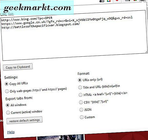 Salin Semua URL adalah ekstensi yang baik untuk Google Chrome untuk menyalin URL halaman situs dengan, yang dapat Anda tambahkan ke browser dari sini. Ini menambahkan URL Salin ke tombol Clipboard ke toolbar browser yang dapat Anda tekan untuk menyalin semua halaman terbuka dengan URL. Jadi buka beberapa halaman tab di browser, dan tekan tombol itu untuk membuka menu di snapshot di bawah ini.