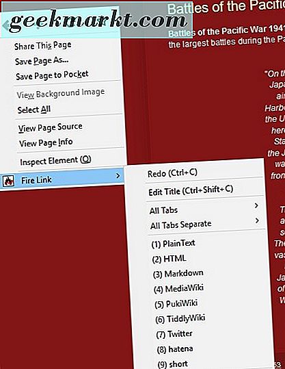 Pengguna Firefox dapat menyalin beberapa halaman URL dengan ekstensi FireLink. Ekstensi ini menambahkan submenu Fire Link yang berguna ke menu konteks tempat Anda dapat memilih banyak opsi. Lihat halaman ini di situs Mozilla dan tekan tombol Unduh Sekarang untuk menginstalnya. Kemudian buka beberapa tab di browser, klik kanan halaman dan pilih menu Tautan Api seperti yang ditunjukkan di bawah ini.
