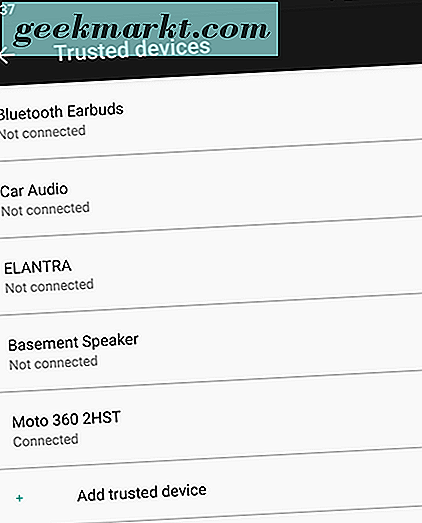 - Perangkat tepercaya: Ini mungkin yang terbaik dari lima opsi Smart Lock, karena itu ideal untuk menjaga perangkat Anda tetap aman saat Anda berada di dekatnya dan menjaga ponsel tetap terkunci saat Anda pergi. Apakah Anda memiliki jam tangan cerdas, pelacak kebugaran, seperangkat headphone nirkabel, atau perangkat lain yang menyelaraskan melalui Bluetooth? Perangkat tepercaya mungkin menjadi opsi untuk Anda, memungkinkan Anda tetap membuka kunci ponsel saat ponsel dipasangkan dengan gadget Anda. Smartwatches dan pelacak kebugaran ideal untuk ini, tetapi juga membantu Anda tetap membuka kunci ponsel saat berkendara di mobil yang dilengkapi Bluetooth, saat menggunakan headphone Bluetooth, atau saat dipasangkan dengan satu set speaker Bluetooth.