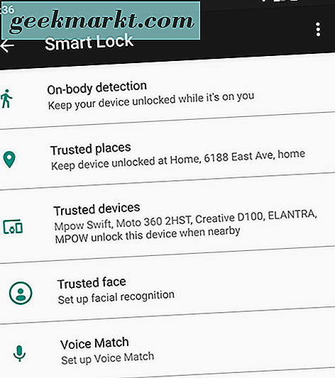 Smart Lock adalah salah satu fitur yang sepertinya tidak perlu dipikirkan, karena sangat mudah diatur dan digunakan untuk keuntungan Anda. Yang mengatakan, menggunakan Smart Lock jelas menimbulkan kekhawatiran keamanan secara keseluruhan, karena itu membuat ponsel Anda lebih sering dibuka kuncinya. Anda akan ingin bermain-main dengan Smart Lock untuk menemukan kombinasi keamanan dan kemudahan penggunaan yang tepat untuk Anda. Mungkin itu berarti membuka kunci perangkat ketika terpasang ke Bluetooth mobil Anda dan ketika Anda di rumah, tetapi menjaganya tetap aman di tempat kerja dan membiarkan deteksi pada tubuh dinonaktifkan. Apa pun kombinasi yang tepat untuk Anda mungkin akan menjadi keputusan pribadi, tetapi dengan lima mode Smart Lock yang berbeda, Anda memiliki banyak pilihan dan kombinasi untuk dipilih.