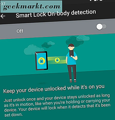 - Deteksi pada tubuh: Pengaturan ini memungkinkan Anda untuk membuka kunci perangkat Anda sekali sebelum menonaktifkan kunci selama telepon berada di tangan Anda atau pada orang Anda. Menggunakan rangkaian sensor ponsel cerdas Anda, perangkat akan melacak kapan perangkat Anda digunakan, sehingga Anda dapat mematikan layar tetapi tetap membuka kunci ponsel saat berada di tangan Anda. Ketika ponsel Anda menyadari bahwa ponsel Anda telah diatur, ponsel Anda akan secara otomatis mengunci ulang, membutuhkan kata sandi. Ini bukan metode Smart Lock yang paling aman, tetapi cukup keren.